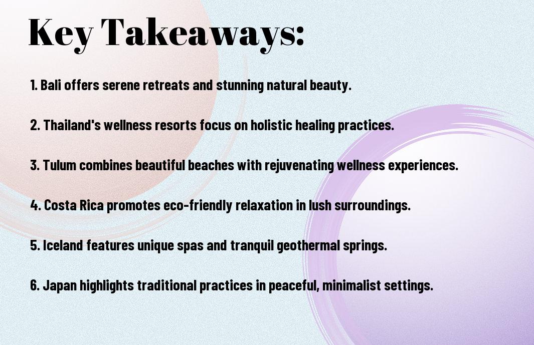 Assuming you seek a serene escape that rejuvenates your mind and body, look no further than these international havens. Each destination offers unique experiences tailored for relaxation, surrounded by stunning landscapes and soothing atmospheres. From lush tropical retreats to sunlit coastal paradises, these places provide the perfect ambiance for you to unwind and embrace tranquility. Discover how you can immerse yourself in these ultimate relaxation spots around the globe.